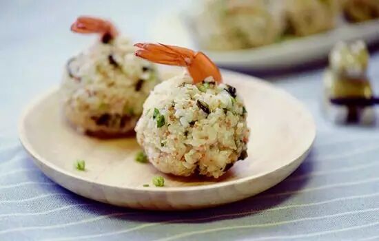 7、戴一次性手套沾上少许水将混合好的米饭用手捏成大小差不多的小饭团。