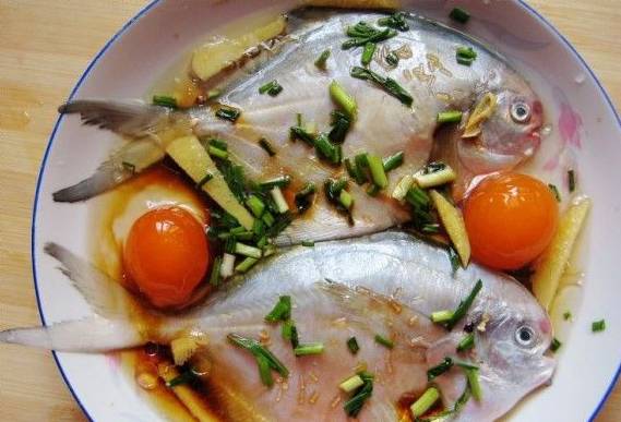 食材:带鱼2条,鸡蛋2个,香菜段少许。