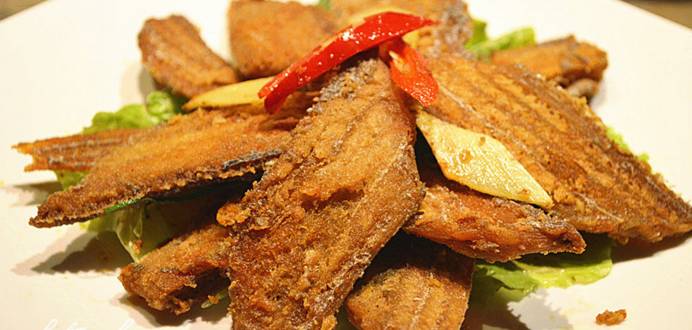 3、热锅倒油,油量不要像炸带鱼时那么多,可是也要比煎带鱼的油要多,油温升高后,放入带鱼,慢火炸制,一面炸好再炸另一面,注意:每块带鱼只翻一次。带炸至微微金黄时,即可捞出控油,趁热撒上花椒盐,就可以了。