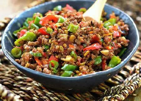 原料:牛肉末300g、尖椒150g、葱姜适量、葱姜适量