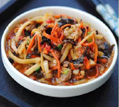 主料:猪瘦肉(适量)、冬笋(适量)、黑木耳(适量)、胡萝卜(适量)