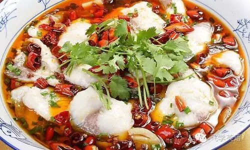 滚烫的油浇在水煮鱼肉上,用厚厚的干辣椒和花椒调味,这道菜可谓是餐桌上的大菜。吃的时候用筷子从香辣的油中挑出鱼肉:油本身是不吃的。川菜中有很多用滚油和香料烹饪的菜,水煮鱼即是其中之一。
