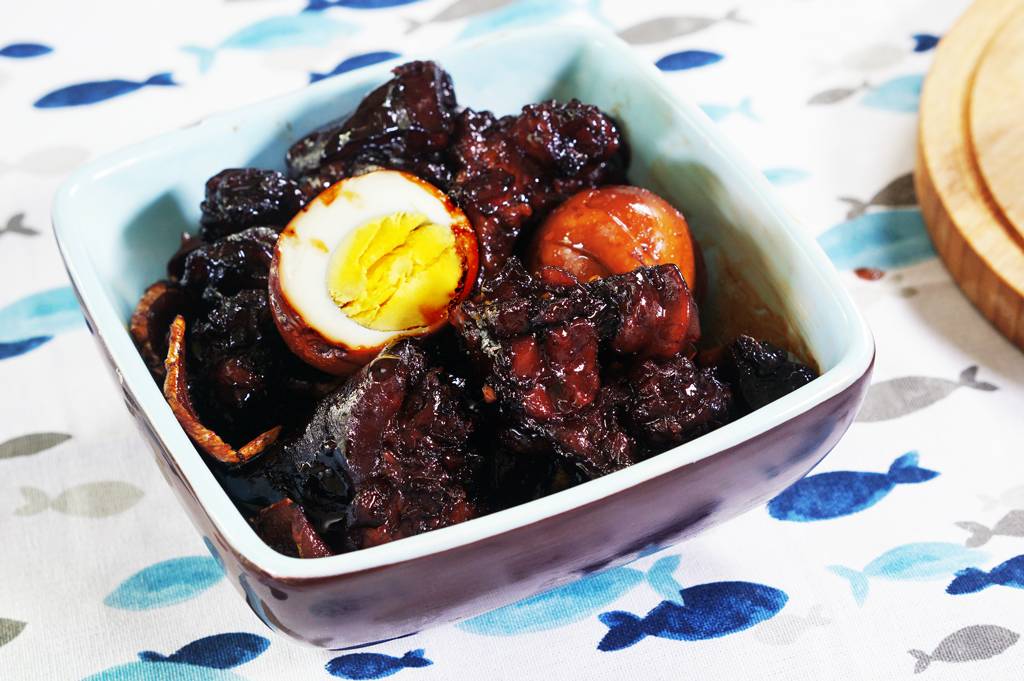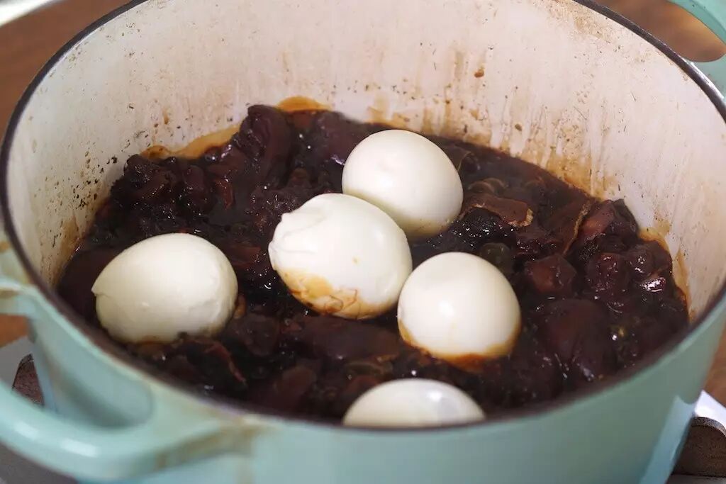 ▲等猪脚煮好之后,把熟鸡蛋剥壳,放到锅里。