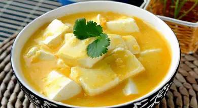材料:豆腐300克,猪里脊肉75克,鲜香菇100克,,蘑菇100克,蚕豆仁100克,南瓜400克,盐1茶匙,胡椒粉1/8茶匙