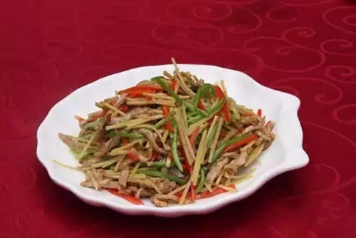 2、锅置旺火上,下鸭丝滑散仔,下仔姜、青椒、甜椒炒香,味味盐、味精炒匀,经香油即成。