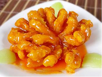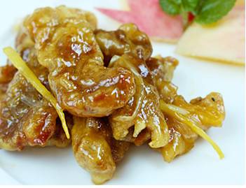 原料:里脊220克、油、盐、花椒粉、葱白15克、姜丝6克、橙汁3大勺、白醋1大勺、白糖2大勺、淀粉130克