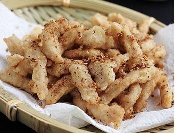 原料:猪里脊肉150克、绍酒20克、香油10克、鸡蛋清2个、面粉50克、水淀粉50克、盐2克、味精1克、油适、花椒盐