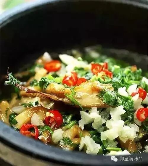 4、把石锅取出来后迅速撒上香菜末、香葱末、蒜蓉和红辣椒圈,然后泼入热油,并用筷子迅速划散鱼肉,瞬间便能激发出香菜和香葱的味道,