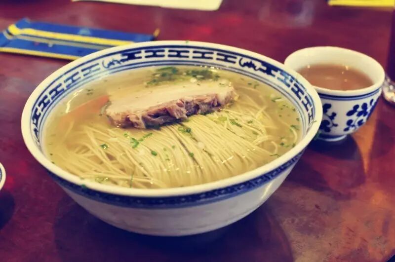 端上来汤是清澈的,面条瘦长瘦长的躺在里面,一股子香味扑进鼻子里。面上的一块大肉才是这碗面的亮点,这肉白白嫩嫩,线条分布均匀,酿过之后,入口香嫩。