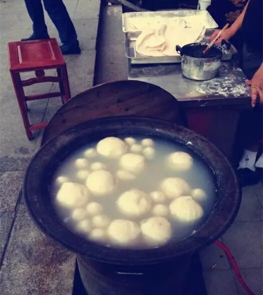 路过时被门口煮汤圆的大锅吸引住了,师傅正把刚包好的汤圆丢进开水里煮,一锅圆滚滚的汤圆在转圈。
