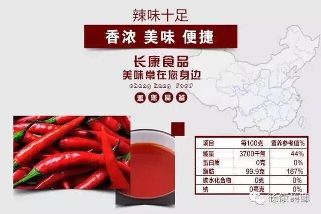 长康辣椒油,香味浓郁、辣味十足,可用于烹饪各种辣味型的菜肴,是家庭酒楼的理想调料。