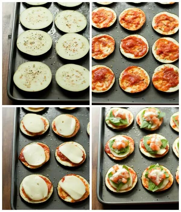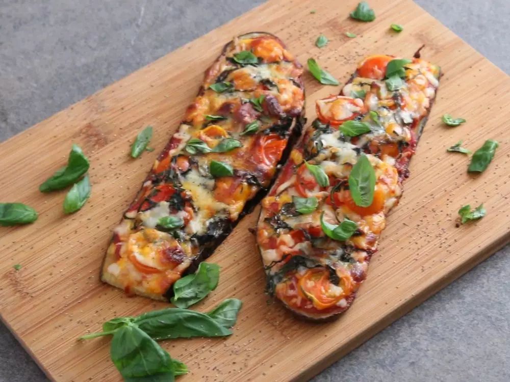 3.在茄子上涂一层番茄酱,再加一层芝士,最后加菠菜和番茄。