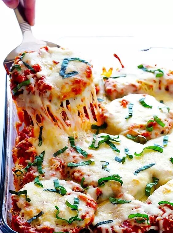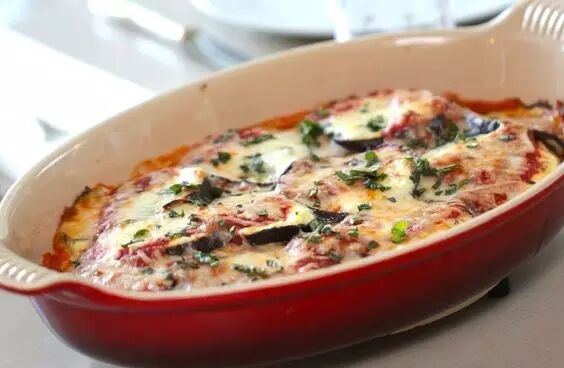 3.在烤盘里,先放进茄子铺满一层,再加芝士,再加一层茄子,最后在表面加入番茄酱。