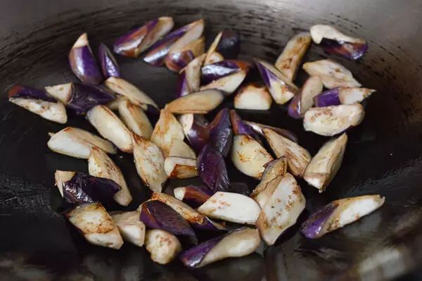 2.热锅入油,加入茄子,炒8-10分钟后起锅。