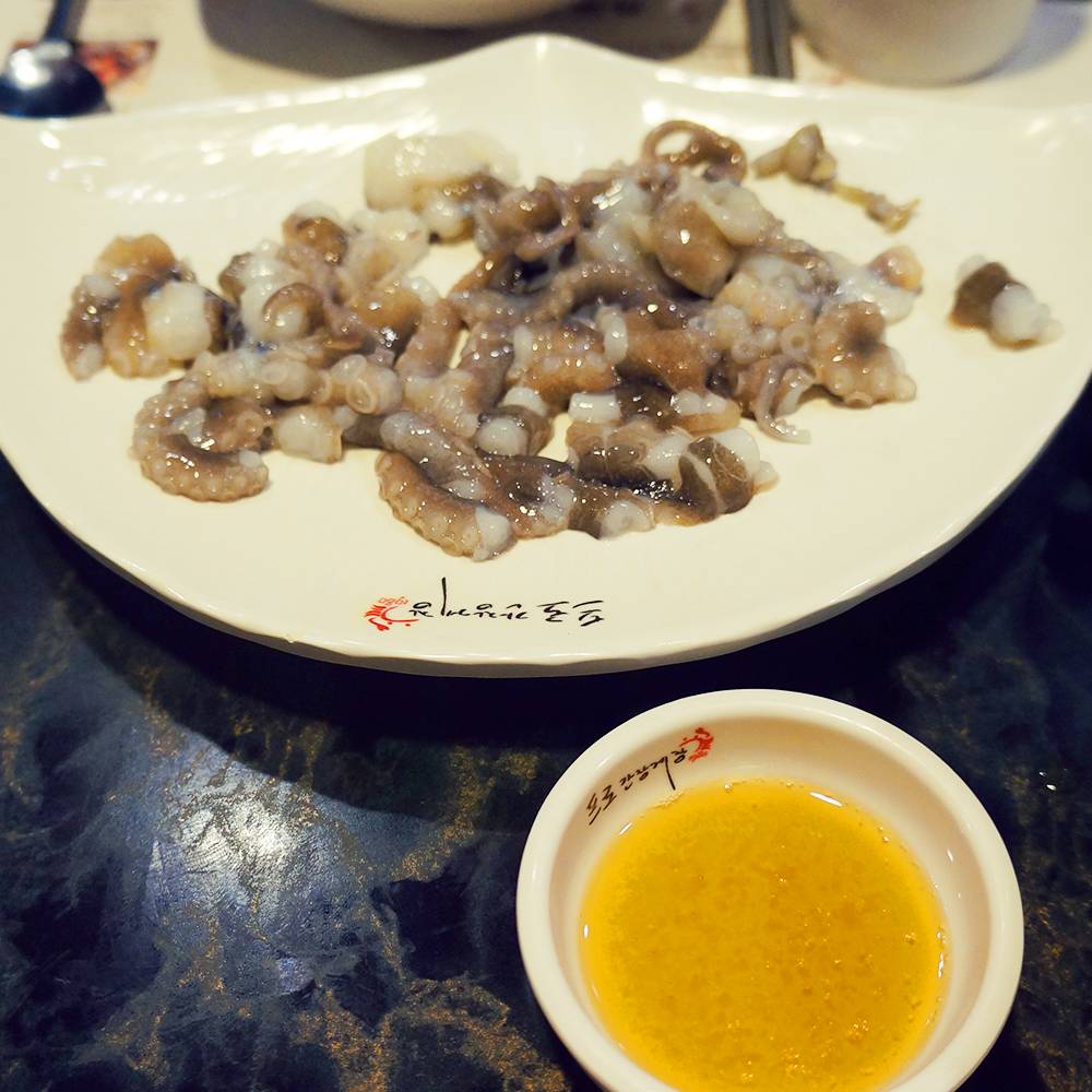 除了酱蟹,我们还点了著名的活章鱼。看到这盘蠕动的生物,没吃过的都挺害怕,吃下去需要队友不停怂恿……
