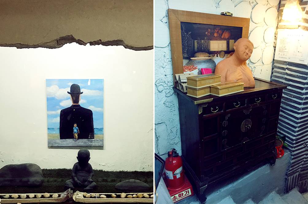 进去之后,感觉像进入了一个山洞,店里的装饰也很特别,有油画,有书法,还有表情诡异的人形雕塑。