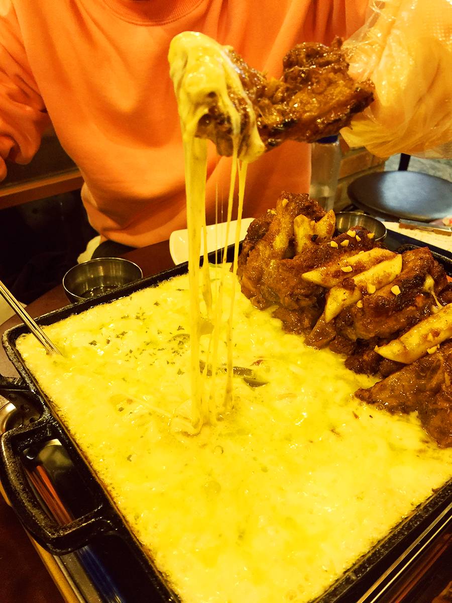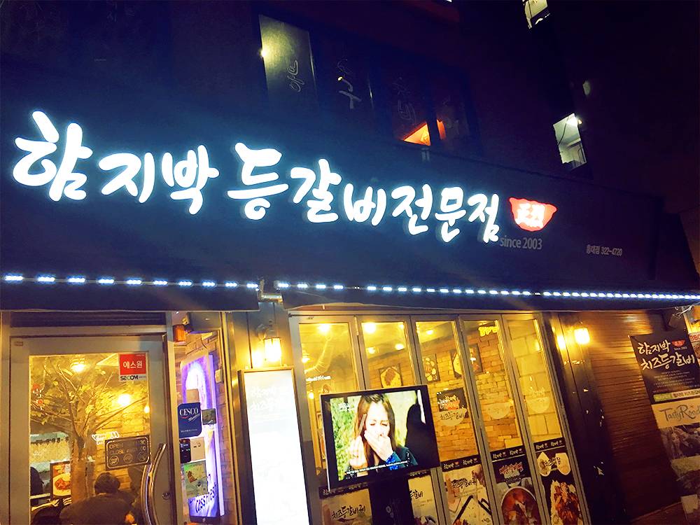 前一晚的猛嗨导致第三天又一觉睡到下午茶。今天我们的目标是弘大,大学生们的聚集地。一下车就在不远处看到了这家感觉很好吃的芝士排骨店,不算大,有点像韩国大排档。
