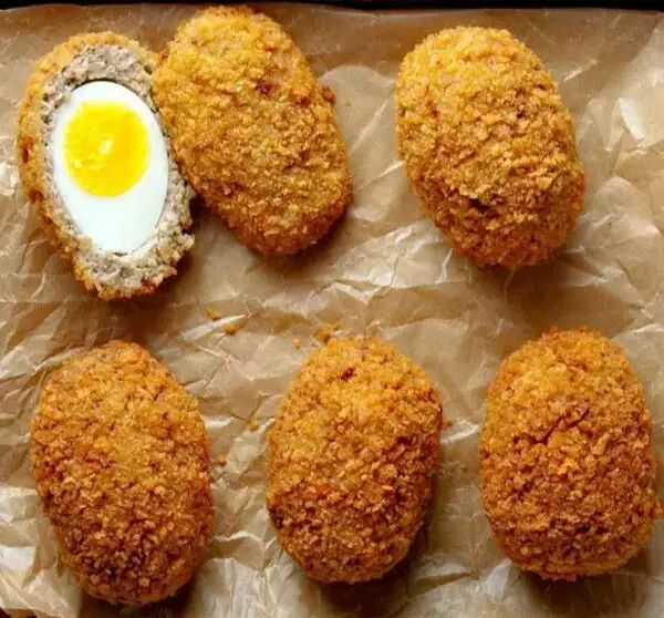 2.将剥皮鸡蛋裹上一层面包渣,再淋一层蜂蜜,然后裹上一层肉松,再裹上一层面包渣;