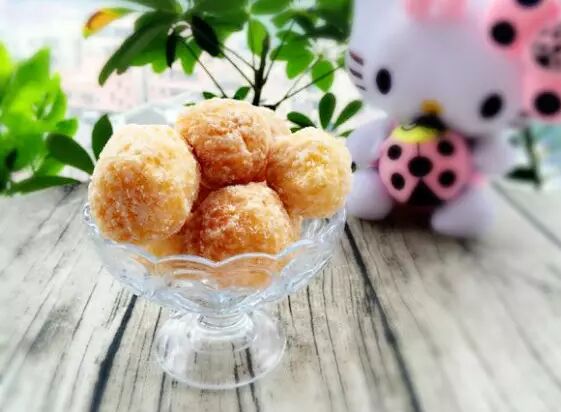 3.油锅烧至三成热,改用小火,将蛋糊做成丸子逐个放入锅中,轻轻搅拌,待蛋球浮上油面,变成淡黄色时捞出滤干油待用;