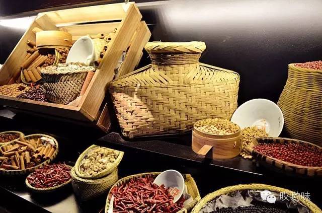 香料陈列的装饰,簸箕、筲箕、玻璃罐、木制储物盒里存放着各种香料。