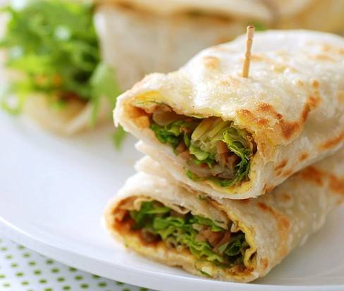 6.备好甜面酱或蒜蓉辣酱或混合,生菜,咸菜丝。出锅的饼抹一层酱,放生菜、咸菜丝,卷起即可。