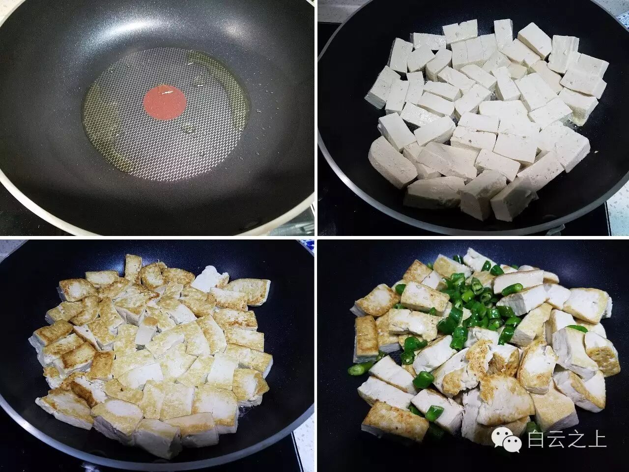 1.俗话说豆腐掉到灰里,吹又吹不得,打又打不得。可见豆腐细嫩易碎,所以尽量先煎黄两面以保持每一块豆腐的完整性。