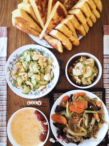 配菜:西葫芦炒鸡蛋,炒杂蔬(洋葱,胡萝卜,口蘑,芹菜,黑木耳),凉拌黄瓜
