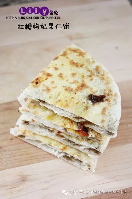 4。取一个面剂子擀成长方形的薄面片,抹上饼馅撒上枸杞。