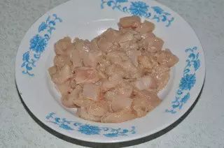 8、锅烧热放适量油倒入鸡丁滑炒。
