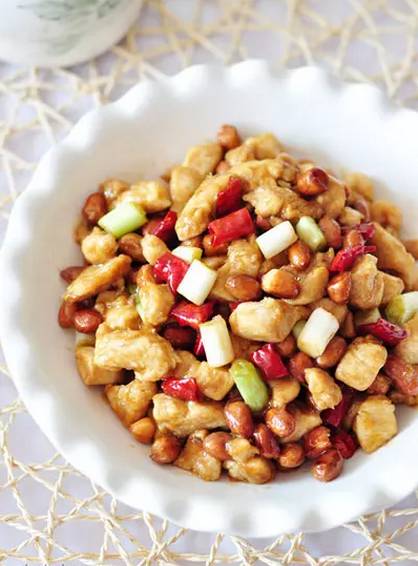 鸡胸肉一块半、花生米适量、葱适量、干辣椒适量、高鲜酱油2勺、糖一勺、醋两勺、盐适量、淀粉适量、胡椒粉一勺、料酒一勺