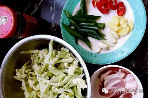 ② 肥瘦相间的肉,最好是五花肉,因为菜花喜油,切成大薄片。姜蒜切碎,豆瓣酱剁碎。爱吃辣的可稍加一点豆瓣酱。