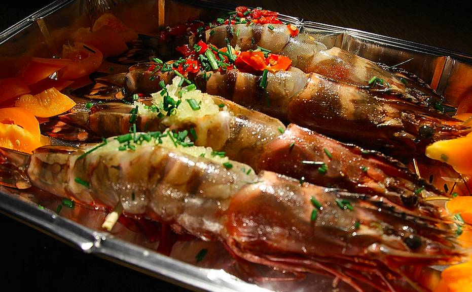 腌制好的大虾整齐的放入烤盘, 在大虾表面刷上一层食用油