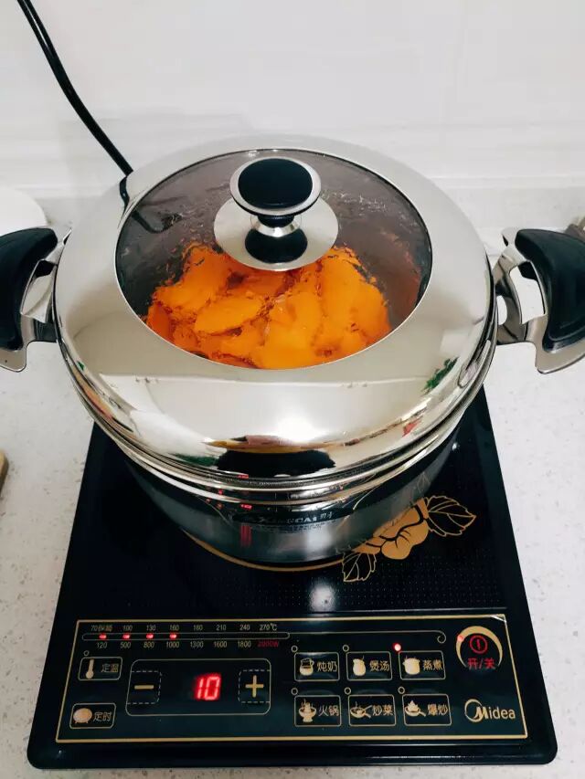 蒸锅置于旺火上烧开,放入南瓜、燕麦,用中火蒸10分钟取出。(由于浅梦的蒸锅比较小,所以浅梦的南瓜和燕麦是分开蒸的~)