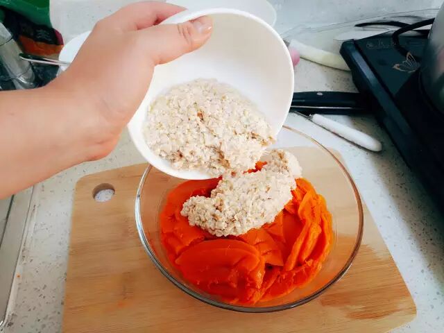 取一个干净的玻璃碗,把南瓜、燕麦倒入其中。