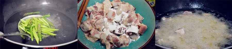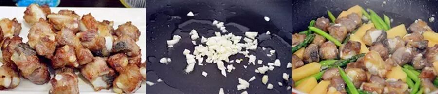 9 加入芦笋、排骨、所有调味料以及哈密瓜炒约1分钟即可起锅装盘。