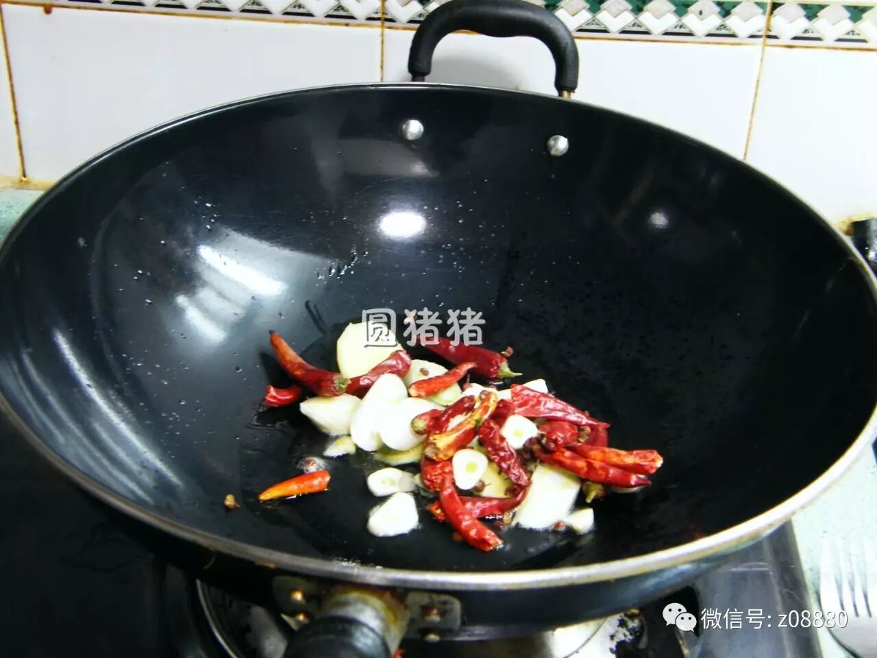 5.另起一锅,锅内放入3大匙油,冷油将姜片,蒜片,葱段,干红椒,花椒爆香。