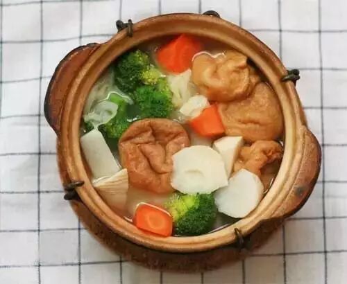 2. 砂锅内加水烧开,先下不容易熟的胡萝卜,山药,笋。过一会再下西兰花,白菜叶,油面筋用手捏扁下入。