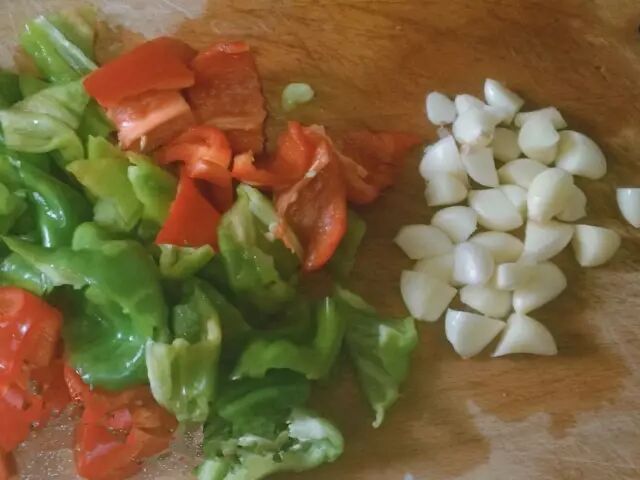 8. 这时候处理配菜,青红椒切滚刀块,蒜头大颗的从中切一刀。