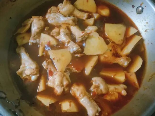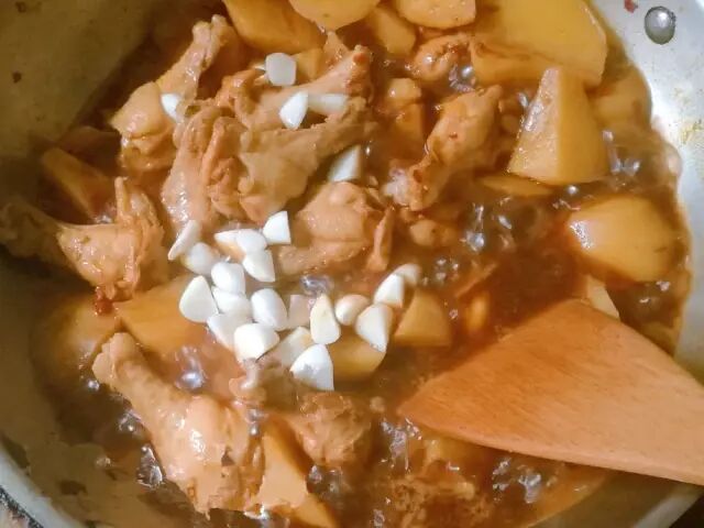 9. 土豆软烂后就开大火收汁,这时候加入蒜头,经常翻动,因为土豆淀粉的关系,特别容易糊锅。