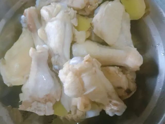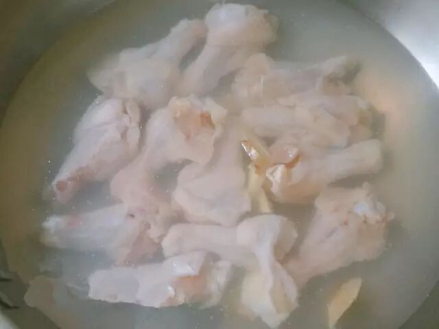 1. 鸡翅根洗净,加入足量冷水,料酒,姜片,大火煮出血沫。