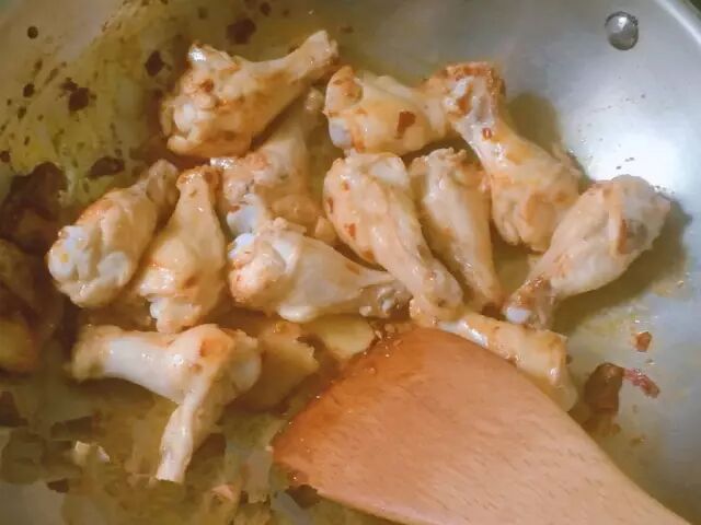 3. 热锅冷油,爆香姜片和郫县豆瓣酱后加入鸡翅根翻炒。不喜欢吃辣可以不放豆瓣酱