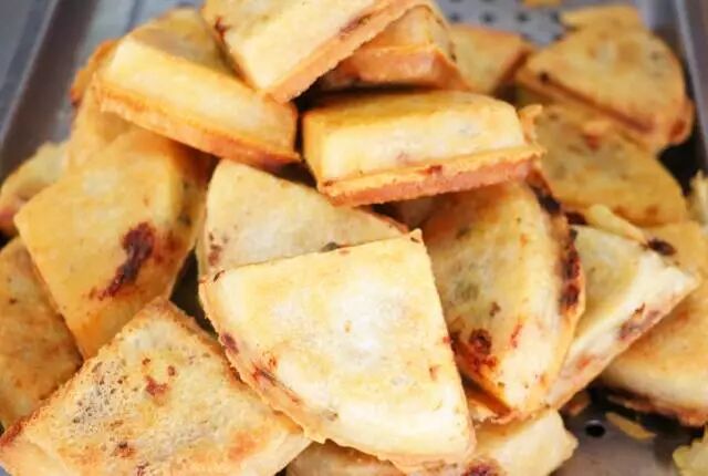 外皮酥脆的面煎粿分为甜咸两种口味,内馅松软而扎实。金黄色的油炸皮,深棕色的粿馅,外酥里嫩,味道鲜香柔润,入口即融,吃后唇齿留香。