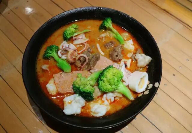 浓郁的花生酱香,加上沙茶香气,新鲜的食材,从各式各样的新鲜海鲜到牛肉猪肉,手工午餐肉,食材鲜美,汤头浓郁,面劲道可口!这样一碗沙茶面可口美味!