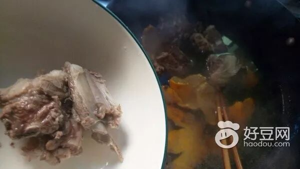 羊排冲洗净后凉水下锅,放入两个桔皮一起煮开
