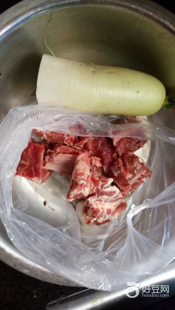 主料:一斤羊排和半条水罗卜。羊排斩成小块