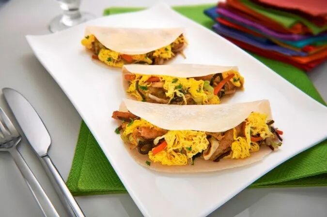 这道美味的前菜由肉丝和多种蔬菜丝组成,加上炸鸡蛋丝让食材的味道更上一层楼。用木须皮包裹成半月形的肉夹饼,更色香味俱全。换成牛肉、鸡肉或鸭肉一样好滋味。