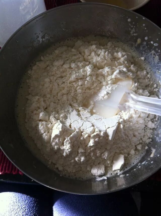 面粉切勿搅拌过度,完全融合,粗糙且多块即可。