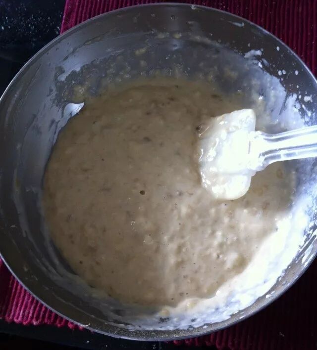 将鸡蛋、牛奶、香蕉泥、植物油(我就用的橄榄油)细砂糖混合,搅拌均匀。