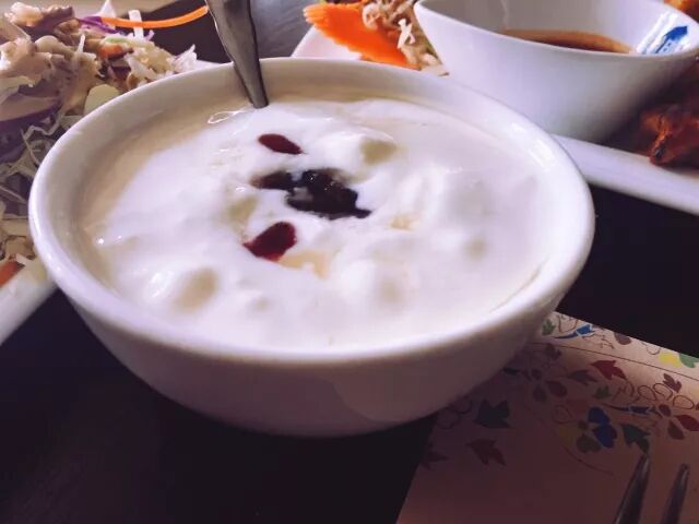 这份酸奶是餐厅送的,上面应该是蓝莓酱,口感很好,吃饱后来一碗酸奶消化一下真的很享受。