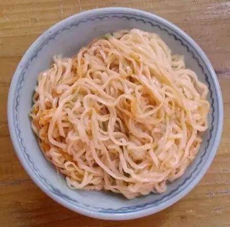 3、将湿面条(湿面条可在市场购买)放在沸水中煮至两三分钟,捞出控水后倒入碗中,淋上新鲜的熬制的红味和炸好的蒜粒,拌匀即可食用。